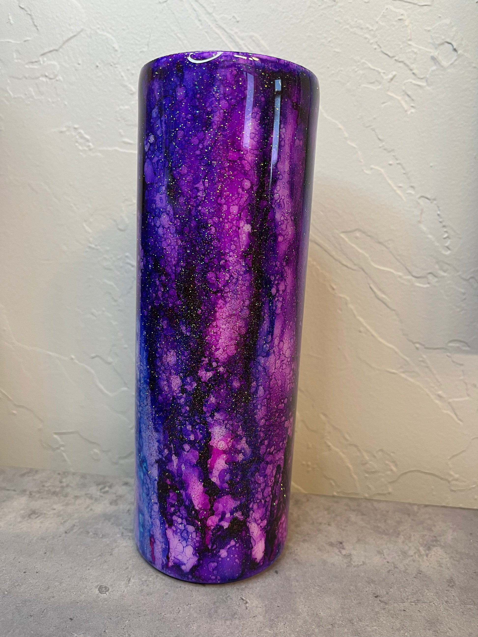 Each tumbler is a one-of-a-kind swirl, with soft marbling and streaks that mimic rainfall on a rusty tin roof—reimagined in romantic, moody hues. It’s the perfect blend of rustic grit and feminine flair.