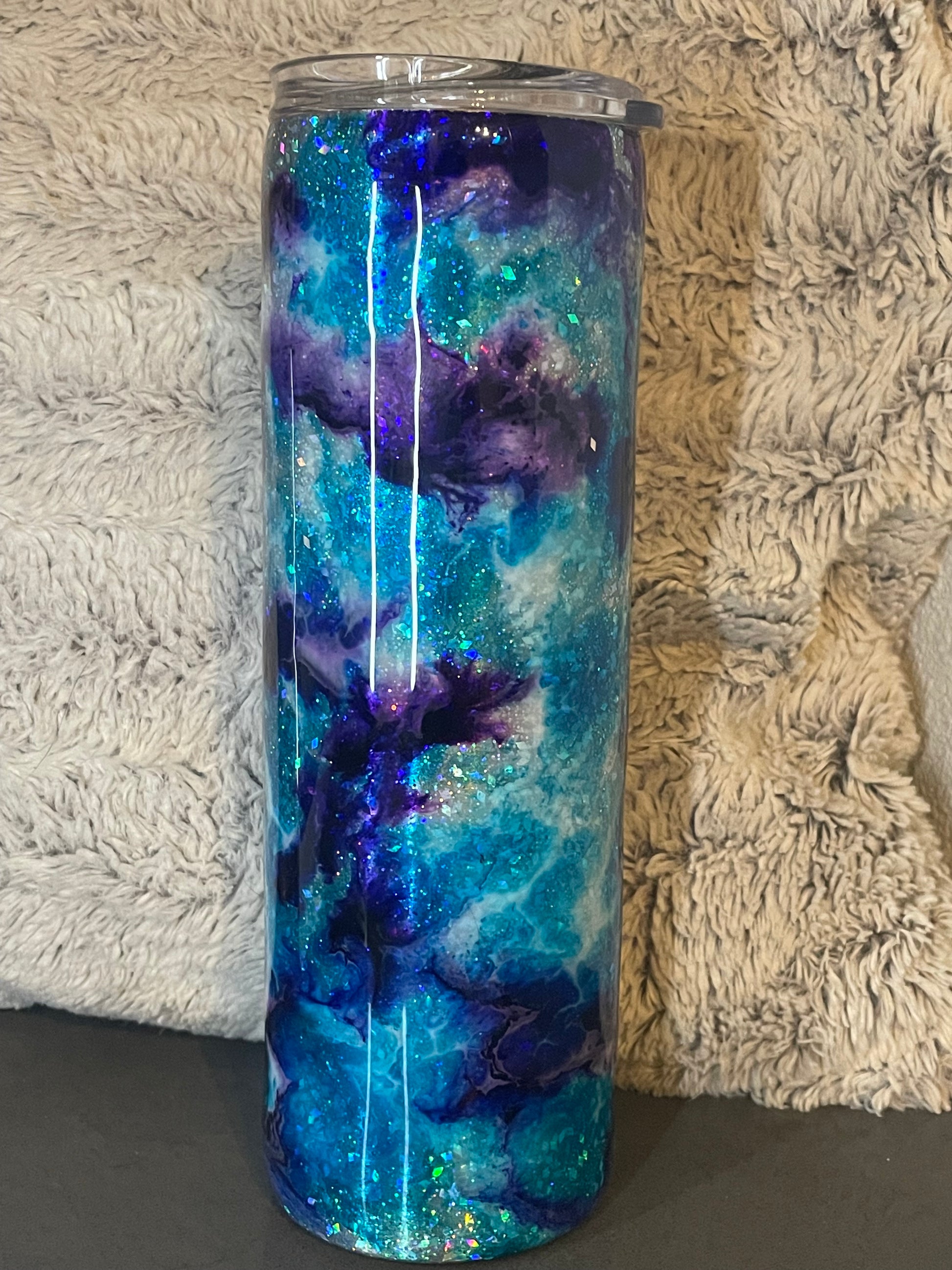 30 Ounce skinny tumbler with straw Blue and Purple with Glitter Base