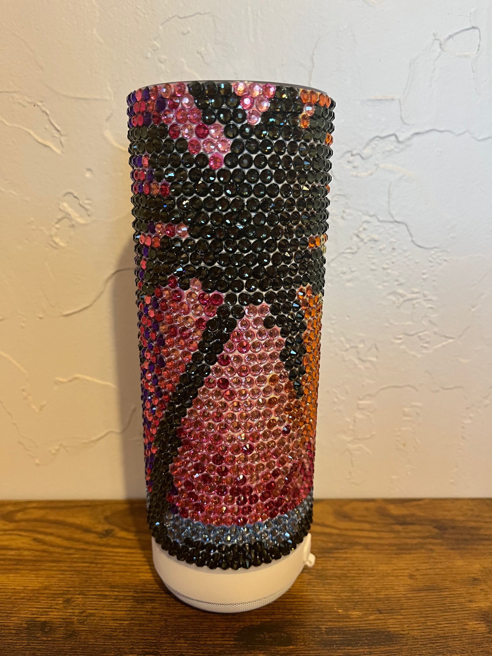 The Palm Tree Rhinestone Speaker 20 oz Tumbler is a stylish and multifunctional accessory that combines hydration and entertainment in one fabulous design. This tumbler features a vibrant palm tree motif adorned with sparkling rhinestones, making it a standout piece for beach lovers and anyone who enjoys a touch of glamour.